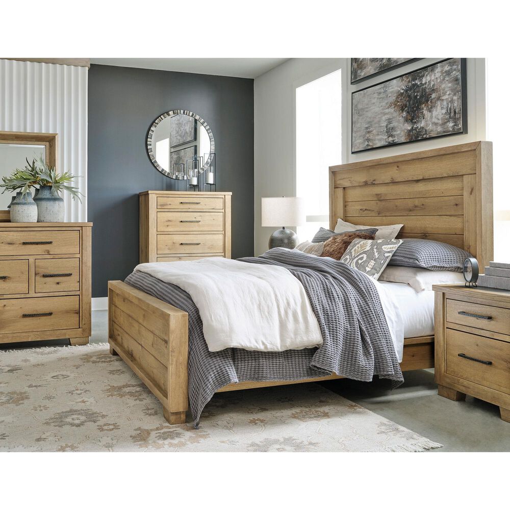 The Galliden queen panel bed expertly refines the raw beauty of wood, bringing a rustic vibe to urban contemporary design. Natural details on the wood, unique to each piece, create an organically beautiful feel in your bedroom. And the stunning simplicity of the materials allows you to seamlessly coordinate this bed with your existing decor.