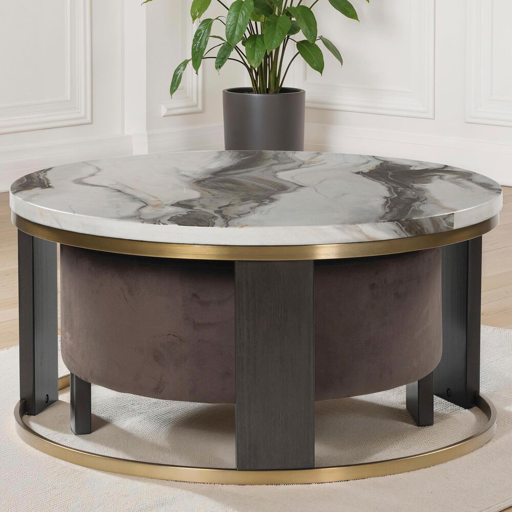 Ultra-contemporary design, everyday convenience. This Jazmore 2-Piece Nesting Cocktail Table Set completes your confidently curated living room with its marble-patterned top and eye-catching brass-tone frame. Dark wood grain on the legs provides a beautiful contrast. Paired with a nesting ottoman in chocolate brown velvet upholstery, this piece serves up must-have function in sophisticated style.