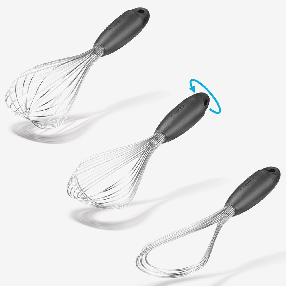 Flisk is a balloon whisk that twists to create three whisks from one. A half turn of Flisk's ergonomic handle twists the 10 large, high-vibration wires into 3 distinct forms - a large balloon whisk for whipping, a sauce whisk for shallow liquids and gravy, and a flat whisk for deglazing. Best of all, Flisk's wires completely flatten for space-saving storage and easy cleaning in the dishwasher. Go on, it's time to whisk it for the biscuit.- Flisk twists to create 3 whisks from 1 - a large balloon whisk for whipping, a sauce whisk for shallow liquids, and a flat whisk for deglazing