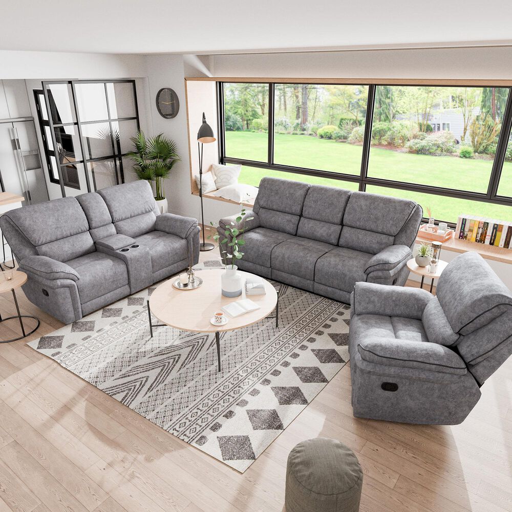 This 3-piece recliner set is perfect for establishing a comfortable living vibe. The gray fabric is a neutral tone that fits any color scheme. Everyone is sure to enjoy movie nights on this recliner set.Product Features
