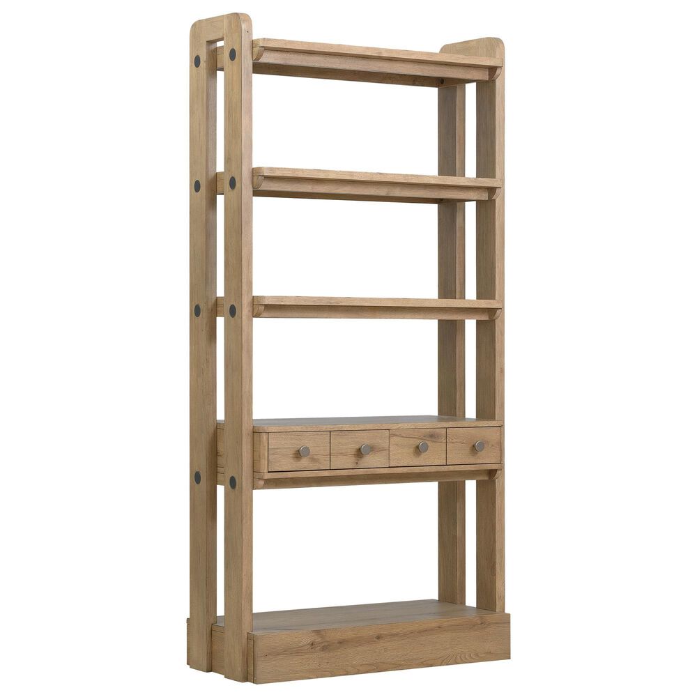 Inspired by industrial design, the Kalamazoo bookcase features an aged oak veneer finish that evokes the feel of vintage workshops. This bookcase offers three shelves for open storage, two center drawers, and a hidden drawer in the base for added functionality. Its exposed connector accents add a rustic touch, making it an ideal piece for both modern and traditional interiors. The four-piece Kalamazoo home office collection evokes the look of furniture salvaged from workshops or industrial settings, featuring oak veneers in an aged finish that adds to the authenticity of each piece.