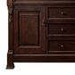 The Brookfield 60" single sink in burnished mahogany vanity by James Martin Vanities features hand-carved accenting filigrees and raised panel doors. Two doors, on either side, open to shelves for storage below and three centre drawers, made up of a lower double-height drawer and both middle and top short-length standard drawers, offer additional storage space. The look is completed with an antique brass finish door and drawer pulls. A matching decorative wood backsplash is included.