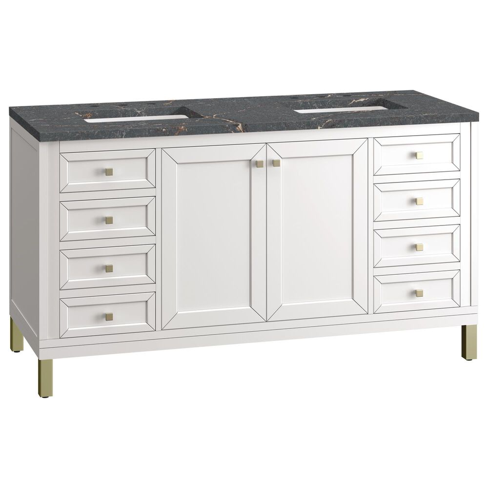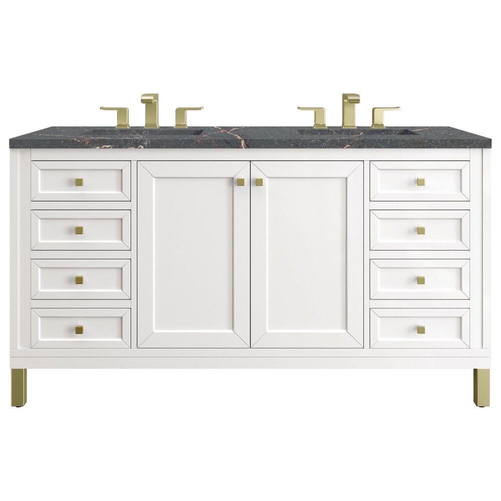 James Martin Vanities Chicago 60" Double Bathroom Vanity in Glossy White with 3 cm Parisien Bleu Quartz Top and Rectangular Sinks