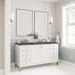 The Chicago collection's sophisticated, subtle details and clean lines make this the perfect choice for any bathroom space. Crafted from Poplar solids and plywood, the Chicago 60" Double Vanity is designed for beauty and function, offering ample storage. The two door cabinet features six drawers and one adjustable shelf. The bottom drawers are double height and the top row drawers are tip-out style. The Glossy White finish is enhanced by the Parisien Bleu Quartz top, offering a deep bluish hue with broad and intricate neutral veins highlighted by fine coppery accents resulting in a dramatic statement. The Champagne Brass finish on the legs, and decorative knobs add a contemporary touch. Choose to forego the metal legs for a modern wall-mounted option.