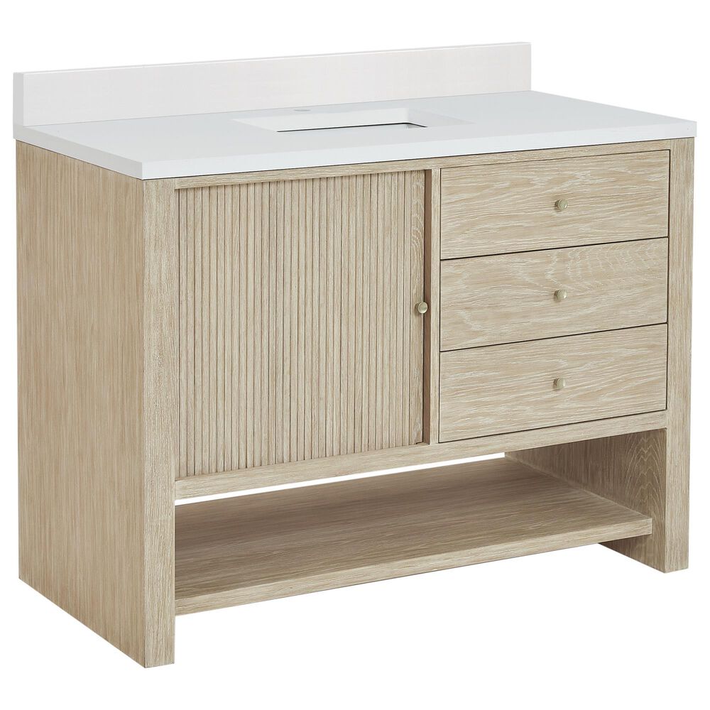 Crafted with precision, the understated waterfall frame of the Marigot 48 Single Vanity is adorned with tambour doors, adding a touch of elegance to its contemporary design. The cerused Sun-washed Oak finish creates a captivating warmth that is accentuated by Hardware: Champagne Brass hardware. Three drawers and one tambour door with an interior shelf and drawer provide ample storage while maintaining a sleek profile. The integrated USB and power outlet and a lower shelf makes this vanity incredibly functional. A pristine White Zeus quartz top and backsplash by Silestone with an undermount rectangular sink complete this striking piece.