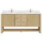 Crafted with precision, the understated waterfall frame of the Marigot 72 Double Vanity is adorned with tambour doors, adding a touch of elegance to its contemporary design. The cerused Sun-washed Oak finish creates a captivating warmth that is accentuated by Hardware: Champagne Brass hardware. Three drawers and two tambour doors with an interior shelf and drawer provide ample storage while maintaining a sleek profile. The addition of two integrated power outlets makes this vanity incredibly functional. A pristine White Zeus quartz by Silestone top and backsplash with two undermount rectangular sinks complete this striking piece.