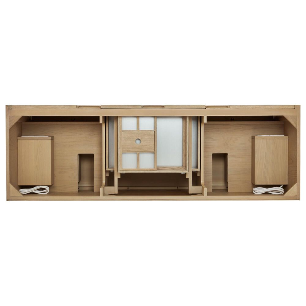 The Solene 72" Double Vanity elegantly weaves together a beautiful blend of natural materials. Framed in solid White Oak, the natural Cane detail and warm Seaside Oak finish make the Solene a stunning centerpiece for your bathroom. The subtle reverse-tapered legs and modern cutout cabinet pulls add visual intrigue to your space. Featuring two integrated USB/120V power units and a removable White Oak drawer organizer, this vanity offers ample storage with its three full-extension drawers and two cabinet doors with interior shelving and two internal drawers, in addition to an open lower shelf.