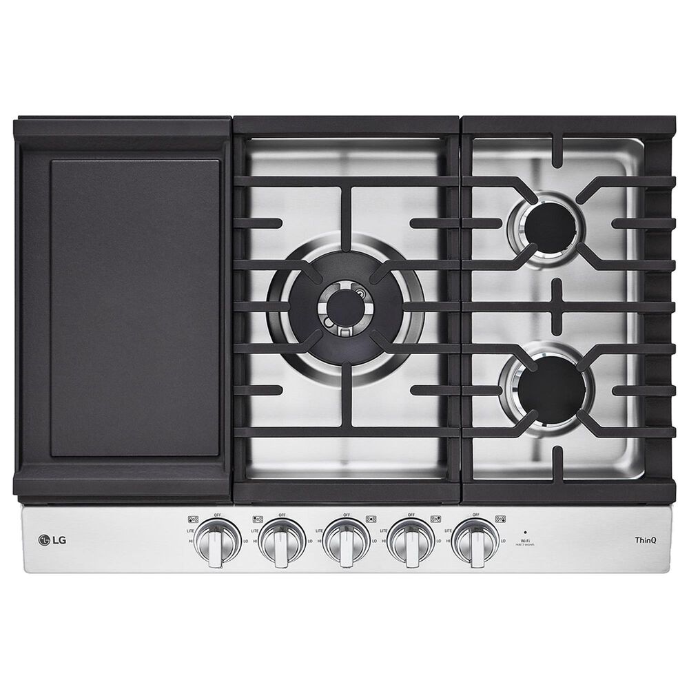 Instantly go from sizzle to true simmer. Five cooktop burners of varying sizes and power levels provide all the power and precision you need. Turn up the power with a dual burner that can rapidly go to high heat for quick boiling, or turn down to a true simmer. The removable cast-iron griddle is perfect for pancakes, eggs and bacon, tortillas and more. Elevate the look your kitchen and deliver premium form and function to your countertop. The white LED knobs conveniently illuminate to let you know which burners are on at a quick glance, while delivering a bit of wow with every turn. Not only do our heavy-duty, continuous cast-iron grates look great, but they also help provide even heating and a stable surface for your cookware. ThinQ and EasyClean make cooking and cleaning a breeze.