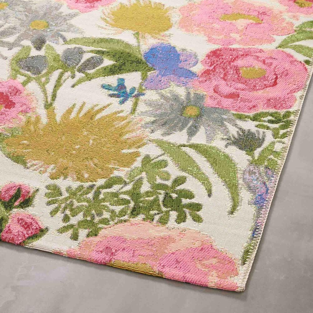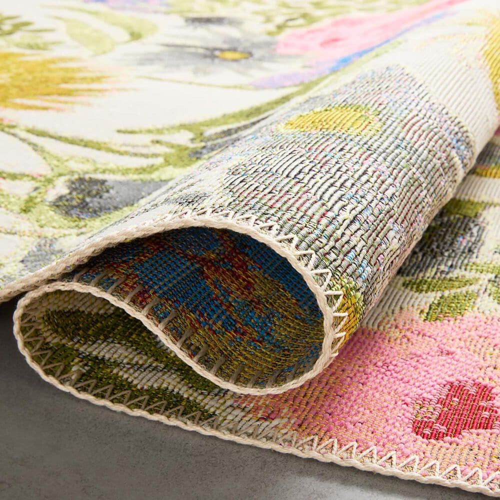 Romantic and maximalist, the Botanical collection goes all-in on large-scale flowers with a poppy, vintage fabric style. These power-loomed area rugs are made of mixed materials in Egypt for both indoor and outdoor use, where all they need is a rinse with a hose to clean when needed.