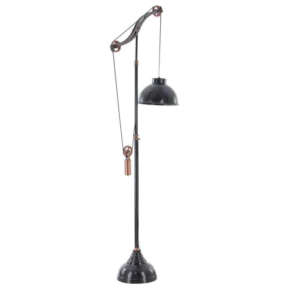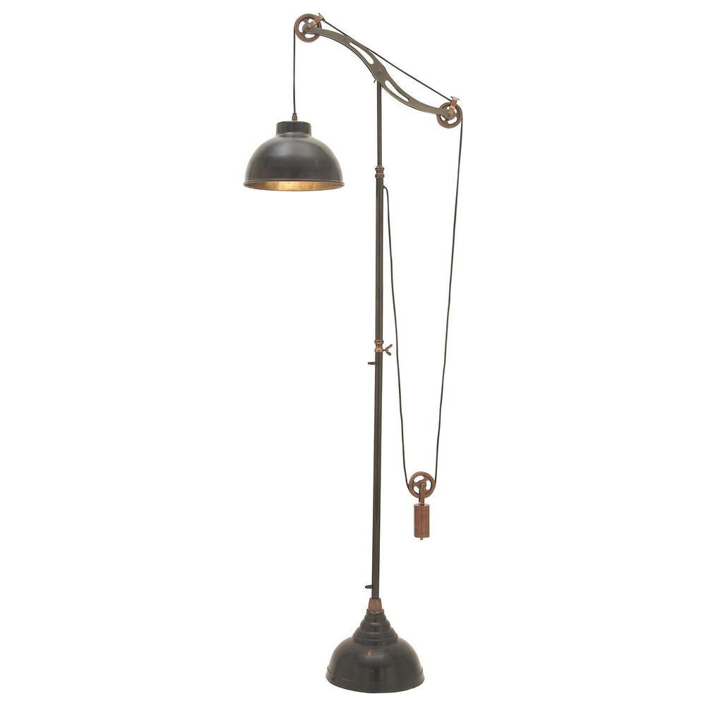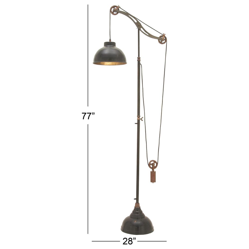 Brighten up any room to create a warming atmosphere for you and your guests with this chic floor lamp. Make a statement with this unique floor lamp on any surface space for a balanced look. Display this accent lamp in your industrial-themed space to bring a warm glow or use as a reading lamp next to your favorite chair. LED screw base standard bulb. This item ships in 1 carton. This item has a 170 cord length. An unique piece of display features an oversized pulley floor lamp crafted in India. Suitable for indoor use only. Some assembly required. A bowl shaped shade made of metal. Convenient on/off foot switch on the 163" cord. Made in India. Designed with an industrial theme.Features