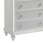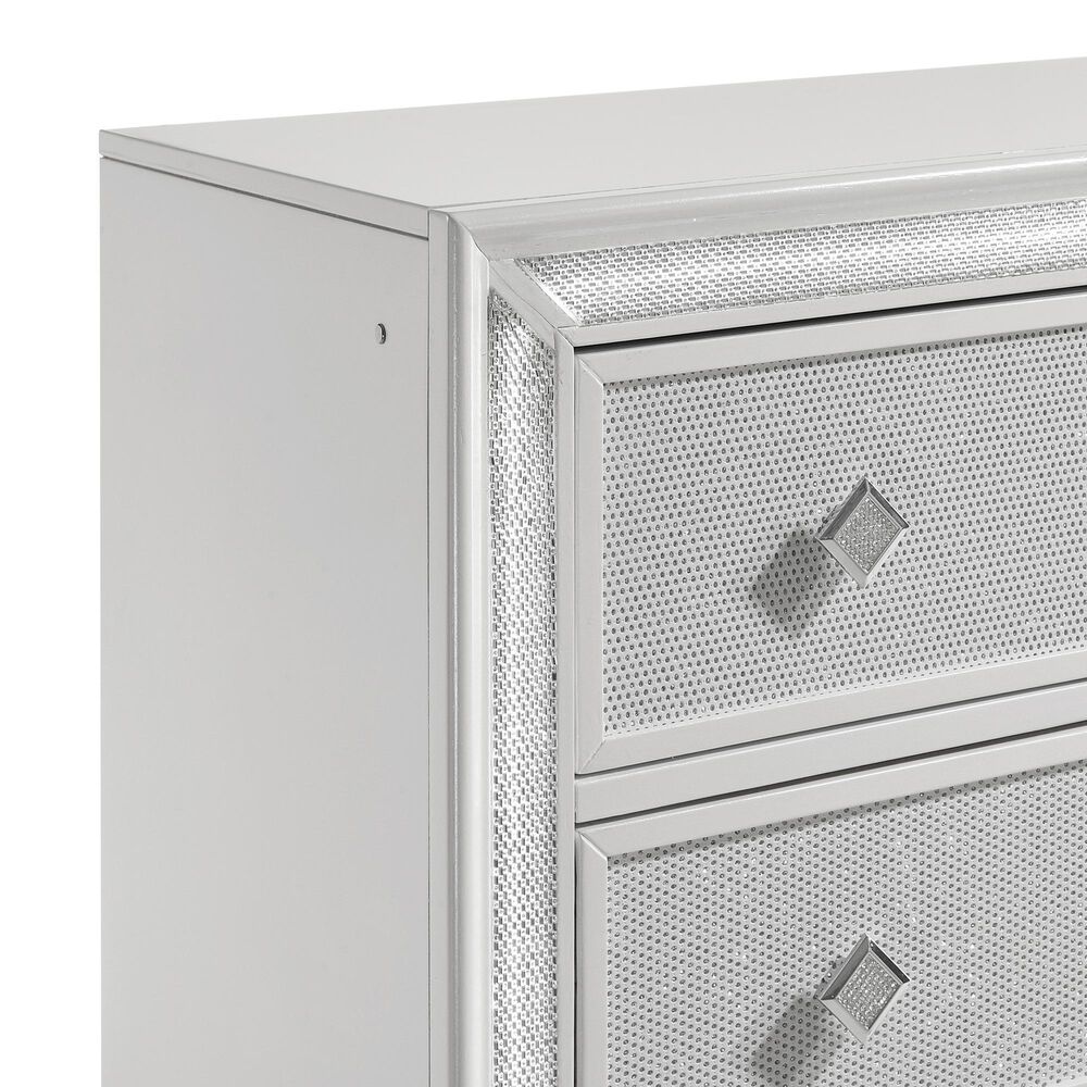 Experience true luxury with the Stardust bedroom suite, an embodiment of sophistication designed to transform your bedroom into a haven of elegance. This exquisite set features a stunning bed, dresser, mirror, nightstand, and chest, meticulously crafted with an unwavering commitment to detail. Each piece is expertly constructed from premium manufactured wood and adorned with an eco-friendly decorative laminate and UV coating for enduring strength and durability. The sleek white finish, gracefully accented by glamorous silver highlights, exudes timeless charm, while the sparkling poly/cotton fabric adds a celestial touch of allure, perfectly complemented by the shimmering crystal hardware. Immerse yourself in the enchanting ambiance created by the LED lighting that gracefully illuminates every corner of this captivating collection. Inside, the drawers reveal a world of craftsmanship, boasting English dovetail joinery, full extension glides, finished interiors, and felt-lined top drawers, offering both elegance and practicality. With diamond-style accents, silver mylar trims, and accent lighting, the Stardust suite epitomizes modern indulgence, making it the ultimate choice for those who demand unparalleled sophistication and charm in their bedroom decor. Includes chest only.What's Included