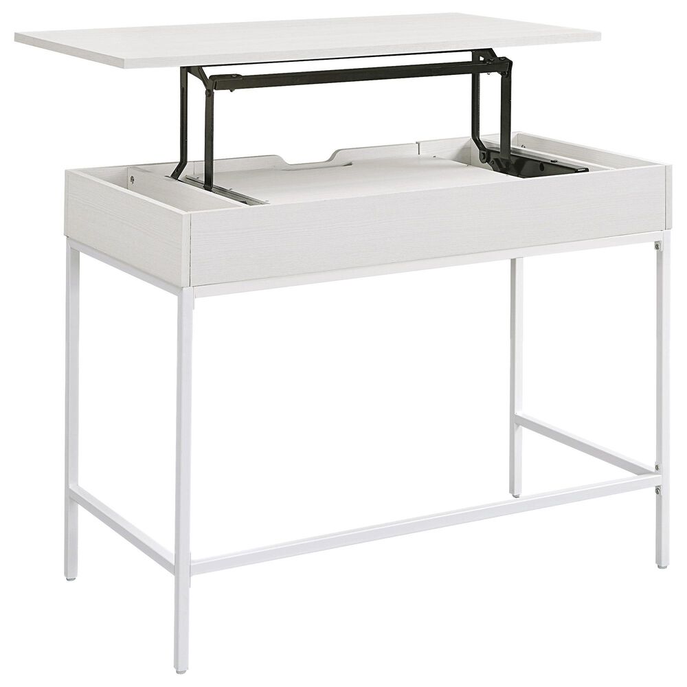 Have it all with the Contempo Sit-To-Stand adjustable height desk. Our Patent pending Work Smart Lift mechanism locks into place, providing just the right desktop elevation, plus, offers a soft-close by safely pausing just above lowest level to avoid slamming. Lowest position provides the classic desk height, mid-position perfect for projects and drawing and upper height ideal for standing. Top drawer useful for storing your supplies and more integrated interior storage keeps your home office tidy and organized. Our woodgrain embossed surface cleans up with just a wipe keeping your workspace looking modern and in order at all times. Simple assembly required.Features
