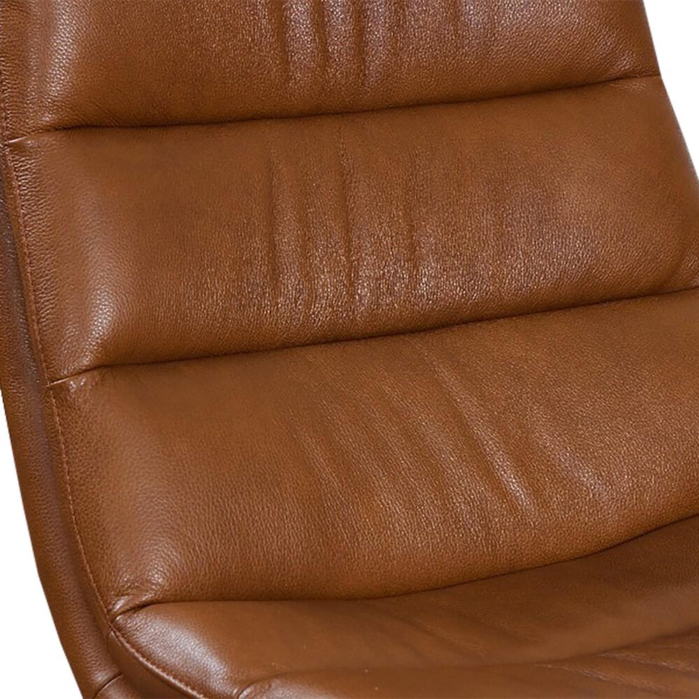 The Cetus camel leather swivel accent chair takes its cue from mid-century modern design. It features an elegant channel back and classic flared metal feet. This chair is not only a playful statement piece but also effortlessly combines modern aesthetics with exceptional quality and comfort.