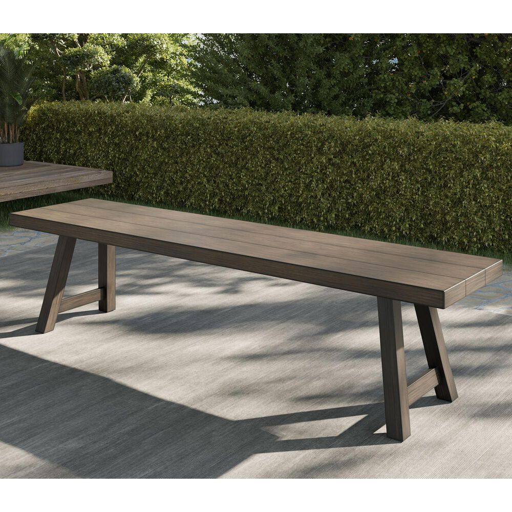 Gather, eat or even work in the great outdoors with the Marina outdoor bench. Styled like a regular dining bench but built for the elements, the Marina patio bench features a powder- coated aluminum frame that is naturally rust-resistant. A double cross-timber pedestal base features a faux-plank top and faux-tenons to replicate the look of wood in an outdoor frame. Waffle foam underneath adds soundproofing and weight to the frame. Eat, work or just enjoy the great outdoors with the Marina patio dining bench.