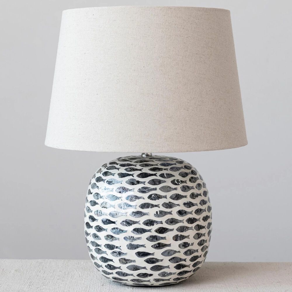 Mood lighting meets modern art in our thoughtfully curated collection of floor and table lamps. Explore a wide array of textures, hues, sizes, and silhouettes to find the perfect fit for any space, including vintage reproductions, lanterns, A-frames, abstract asymmetrical bases, figurine lamps, and so much more. Choose from a vast selection of materials from solid marble and reclaimed wood to terracotta and glass, and styles from mid-century modern and classic farmhouse to vintage glam and boho. The thoughtful placement of a floor or table lamp from this hand-picked collection will create a warm and welcoming ambiance that is guaranteed to impress. This nautical table lamp features an intricately pieced capiz fish design on a bamboo base and finished with a white linen shade. Display in a living space of any style from coastal to nautical. Maximum 60W bulb not included. Made from bamboo and capiz.