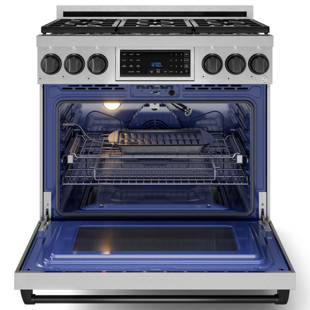 The Gordon Ramsay 6 Cu. Ft. 36" Professional Natural Gas Range with Black Handle Kit in Stainless Steel, designed for chefs who demand precision and power. With high-output burners, even heat distribution, and intuitive controls, this 36 inch gas range in stainless steel/black elevates your cooking experience. Built for durability and performance, it brings restaurant-grade quality to your home kitchen, making every meal exceptional.