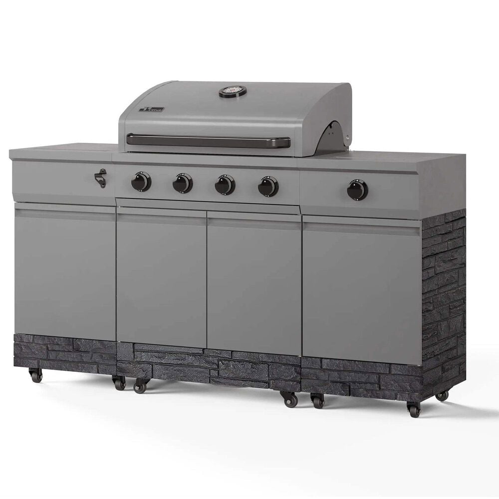 Create the ultimate outdoor cooking experience with the TYTUS Fresno island grill, your go-to BBQ grill for delicious meals. Setting up is a breeze with our no-tool assembly design, allowing you to have the grill ready in less than 5 minutes. This gas grill boasts four sturdy 304 stainless steel burners, ensuring even heat distribution for mouthwatering results. With 48000 BTUs, it's the perfect addition to any backyard BBQ setup. Whether searing steaks or slow-cooking ribs, this grill has you covered. With 510 sq. inches of primary cooking area and 209 sq. inches of secondary space, it's ideal for gatherings of any size. On one side, the 12000 BTU side burner adds versatility for all your grilling needs, and the other side features a 304 stainless steel ice bucket to keep your favorite drinks cold. The piezo ignition system ensures easy lighting, while individual burners reaching up to 650-degree F provide precise cooking control. Enclosed storage and a built-in bottle opener add convenience to your grilling experience. Complete with a stylish matte gunmetal finish and stone accents; the TYTUS Fresno island grill is a must-have for any outdoor space. Get ready for great food and good times with TYTUS Grills.