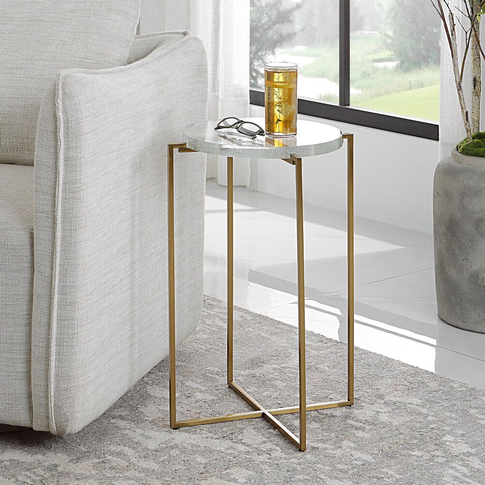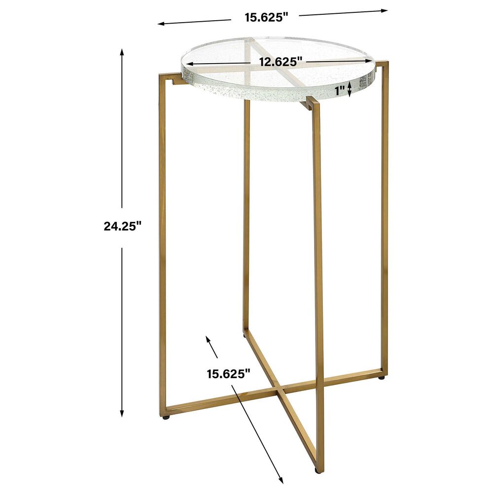 Sleek And Sophisticated, This Accent Table Showcases A Petite Stainless Steel Frame Finished In Brushed Gold And Is Accented By A Thick Seeded Glass Top.Features